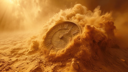 Vintage clock in desert during sand storm, surreal scene with motion of old dial on dust background. Concept of time, art, history, nature, waste and past. Generative AI