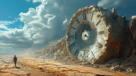 Old clock and lonely person in desert, surreal scene with vintage dial and man on landscape background. Concept of time, art, history, nature, waste, infinity and past. Generative AI
