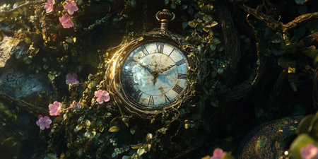 A close-up of a pocket watch covered in vines and flowers, symbolizing the intertwining of nature and the passage of time