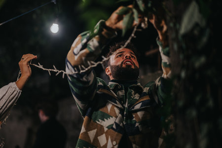 Man decorating outdoors under a string light for a festive evening gathering