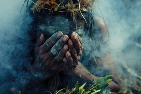 Indigenous man performing a ceremonial ritual with smoke and fire outdoors in a lush forest setting