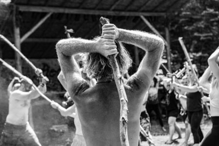 Diverse people enjoy spiritual gathering A black and white view of a mixed group of people from all backgrounds practicing tai chi with sticks in a forest clearing, exercises for mindfulness and health