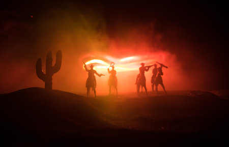 Western concept. Battle between cowboys at night. Duel to the death. Creative artwork decoration on toned foggy background in selective focus