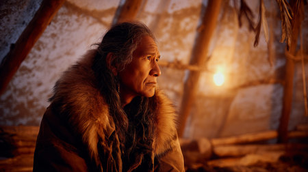 Indigenous elder telling stories inside a warm tent, frost on the outside wall. Life in permafrost conditions, climate change problems on the planet. Global warming.