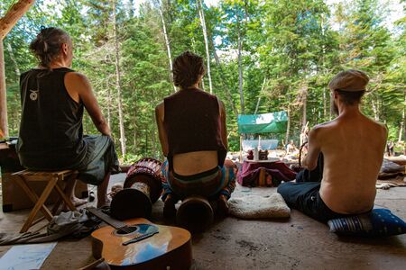Diverse people enjoy spiritual gathering Three men of varying ages are seen from behind, sitting around a campsite in a forest clearing during a retreat dedicated to native and shamanic cultures.