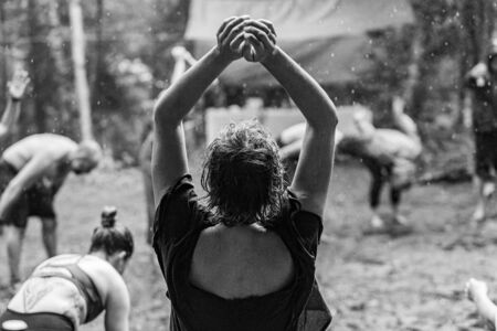 Diverse people enjoy spiritual gathering A close up monochrome view of a free-spirited woman, seen from behind with arms raised during a free and playful dance group in woodland, with copy-space.