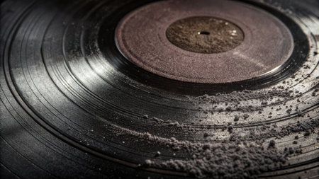 A close-up view of a spinning vinyl record, capturing the intricate grooves and the mesmerizing motion of the analog medium