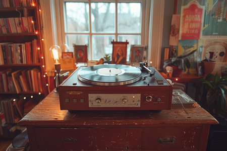 A vinyl record rotates on the turntable, with the needle gently tracking the grooves, creating an immersive musical experience.