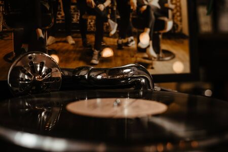 Vinyl record on turntable close-up. Retro style