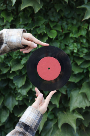 Hands holding vinyl record on green leaves wall background
