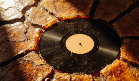 A worn vinyl record lies in a sunlit crack of golden-brown earth, capturing the warmth of the sunset. Shadows play around it, creating a nostalgic and artistic scene of warmth and music.