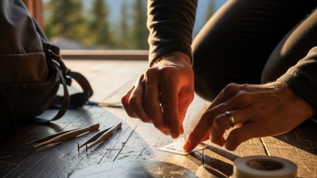 Hands arranging natural elements on rustic table: sticks, stones, leaves, and seeds. That the image is generated using AI.