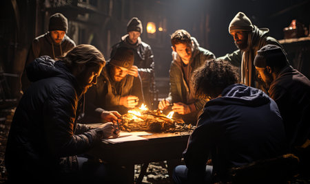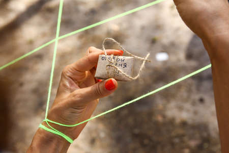 Closeup image of cropped hands man demonstrating a native traditional method for natural fire lighting during world and word festival