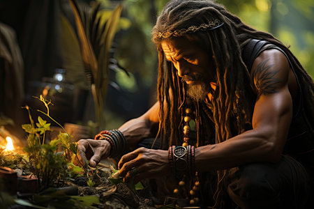 Shaman leads healing ritual with herbs and corners in the fire of the fire., generative AI