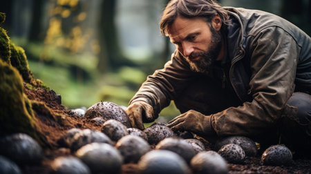 Close-up on paleontologist with dinosaur nest revealing embryos among ancient trees