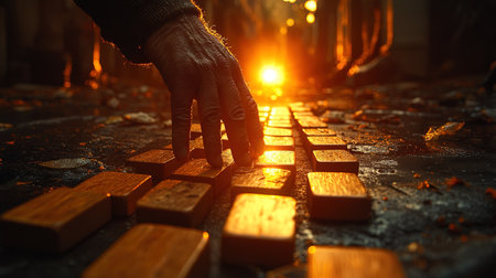 Construction worker is laying wooden blocks on a building site at sunset, creating a warm and dramatic scene