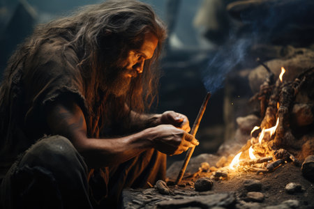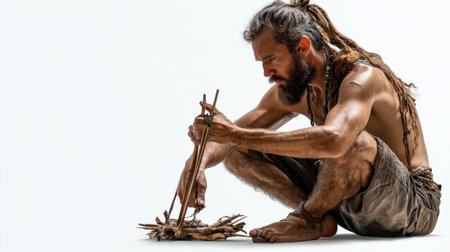 A man sits on the ground with a stick in his hand, preparing to light a fire. Concept of primitive living and the importance of fire for survival