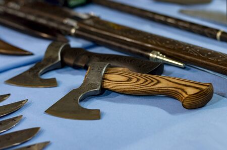Two small axes with wooden handles on a table among knives and sabers. Close-up. Front view from above.