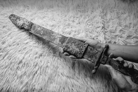 Laying the antique real sword on a handmade wool blanket