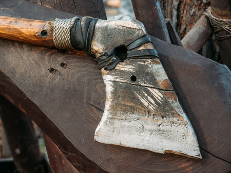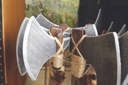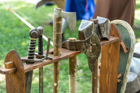 Medieval metal ax and sword in a wooden stand on the festival. Old dark ages weapon and equipment for knights battle. Historical and medieval concept. Close up, selective focus