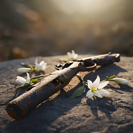 Old gun lying on the ground with white flowers. Selective focus.