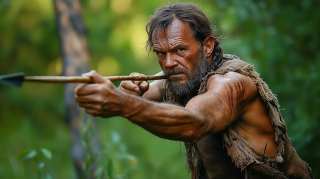 rugged, primitive man aiming a spear, showcasing survival instincts and strength amidst a wild, forested environment.
