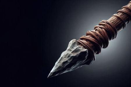 Primitive stone spearhead on dark slate background