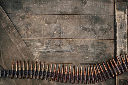 Machine gun belt with cartridges for MG 34-42 of the USSR on a wooden background. Top view, place for text.