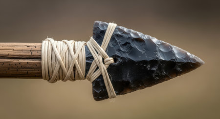 Primitive obsidian arrowhead with wooden shaft and leather binding on black background