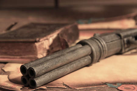 Old gun on a background of an old book close-up.