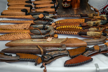 Collection of traditional handmade knives with engraved metal blades and carved leather sheaths. Local craftsmanship, heritage, artisan knife-making culture