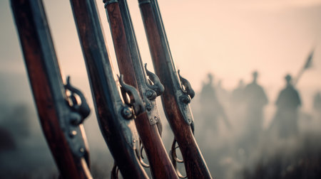 A close-up focuses shot on a row of historical rifles with their detailed locks and wooden stocks, set against a hazy, blurred background of soldiers marching, evoking a sense of historical conflict and military history.