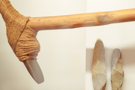 Stone age tools on wooden background