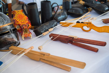 Handmade wooden toy crossbows at outdoor market