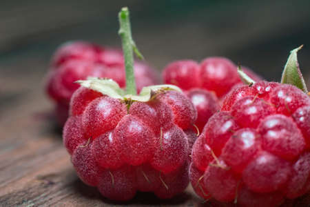 Ripe red raspberries on a wooden table close up.