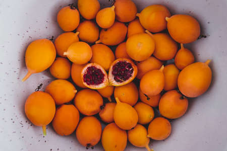 Exotic and tropical fruit of red color with multiple balls forming an agglomeration