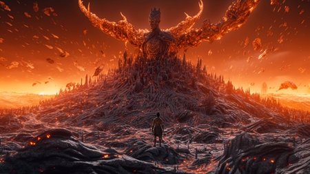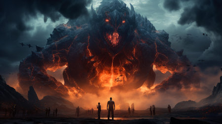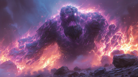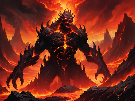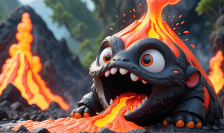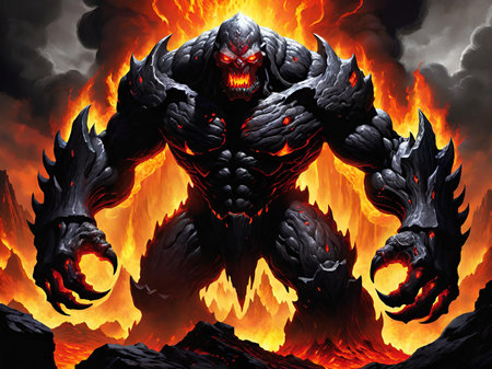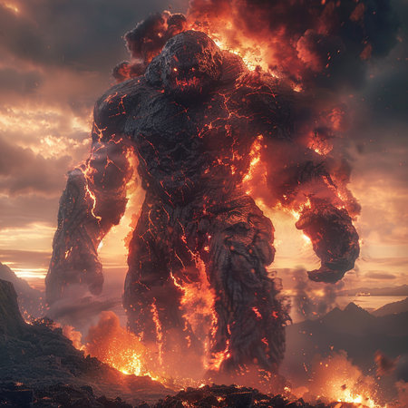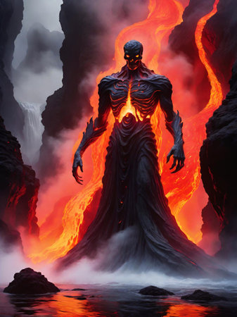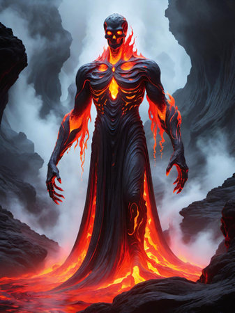Fiery lava monster emerging from volcanic eruption