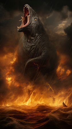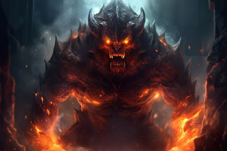 evil monster with a burning fire in the background