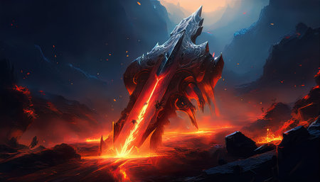 Warriors clash near a massive sword embedded in molten lava, under a dramatic sky at dusk.