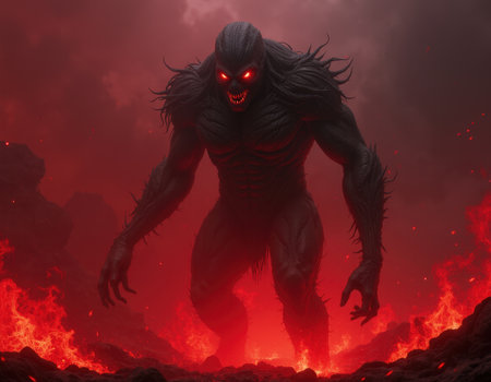 A formidable dark creature stands illuminated by fiery elements, its glowing eyes piercing through a shadowy backdrop. Dark, textured skin and prominent horns create an imposing presence, evoking a sense of raw power and danger.