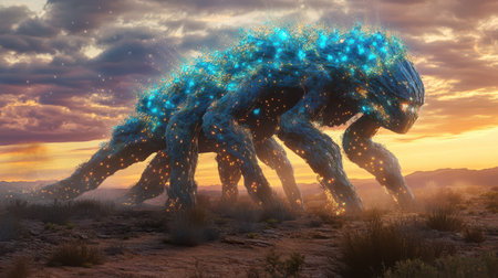 A colossal alien life form roams a desolate terrain, its back adorned with luminous, plant-like growths that gather energy. The sky glimmers with twilight hues, enhancing the surreal atmosphere.