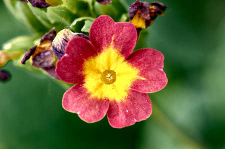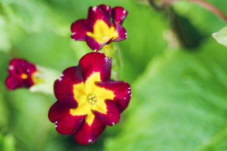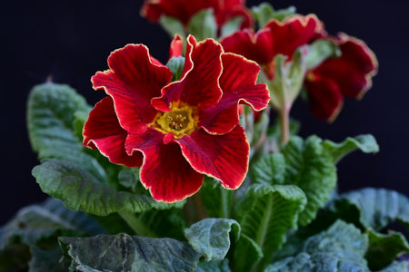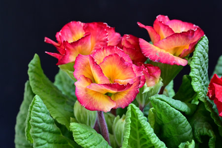 beautiful red and yellow primula flowers, popular tropical ornamental plant specie from America