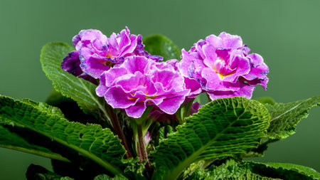 Close-up of violet primula flowers with ruffled petals and green leaves covered in water droplets, set against a green background