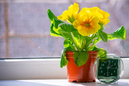 the transition to summer time, the arrival of spring, the clock standing on the sun-drenched window-sill next to the yellow flower, a place for the inscription