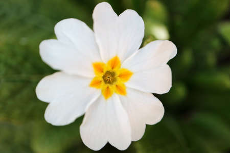 White Primula with delicate petals ,yellow stamens and green leaves in the garden, spring white primula macro, floral photo, macro photography, stock photo