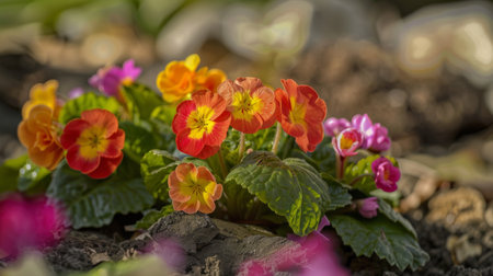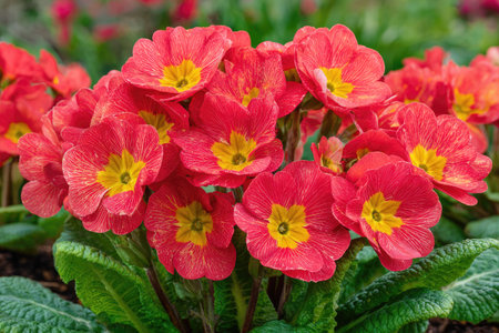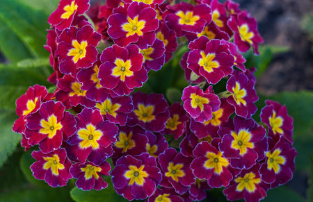 beautiful red and yellow primula flowers, popular tropical ornamental plant specie from America