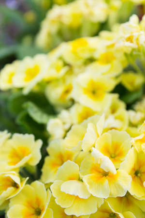 Easter concept. Primrose Primula with yellow flowers in flowerbed in spring time. Inspirational natural floral spring or summer blooming garden or park. Hello spring
