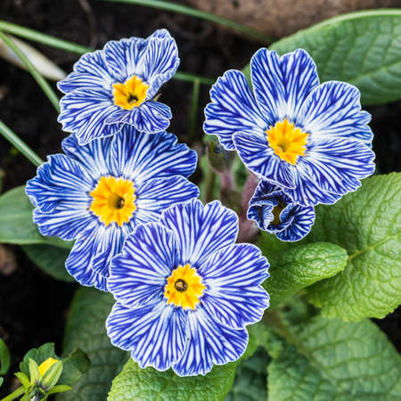 Primrose (Primula vulgaris) in bloom. Beautiful blossom of yellow and blue primula plants close up