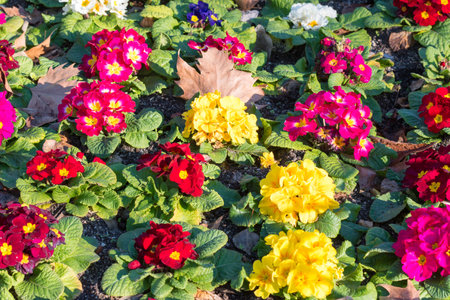 Multicolored garden primrose flowers, top view. Spring background, flower background, spring flowers
