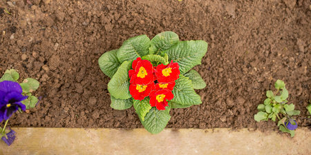 A yellow and pink primrose , Primula vulgaris, on a planting bed with text free space, springtime concept background, view from above
